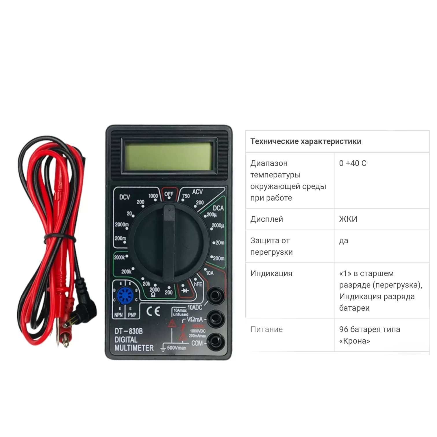 Digital Multimeter DT 830B подходит для измерения напряжения в электрической сети между двумя точками, сопротивления, значений тока. С его помощью можно проверить на целостность полупроводниковый диод, определив его напряжение, прозвонить электросхему при сопротивлении до 5 Ом, протестировать полупроводниковый транзистор, измерить индуктивность и электрическую емкость. Измеритель емкости и индуктивности имеет ЖК-дисплей и низкое энергопотребление и даже при ярком солнце показывает четкое изображение.