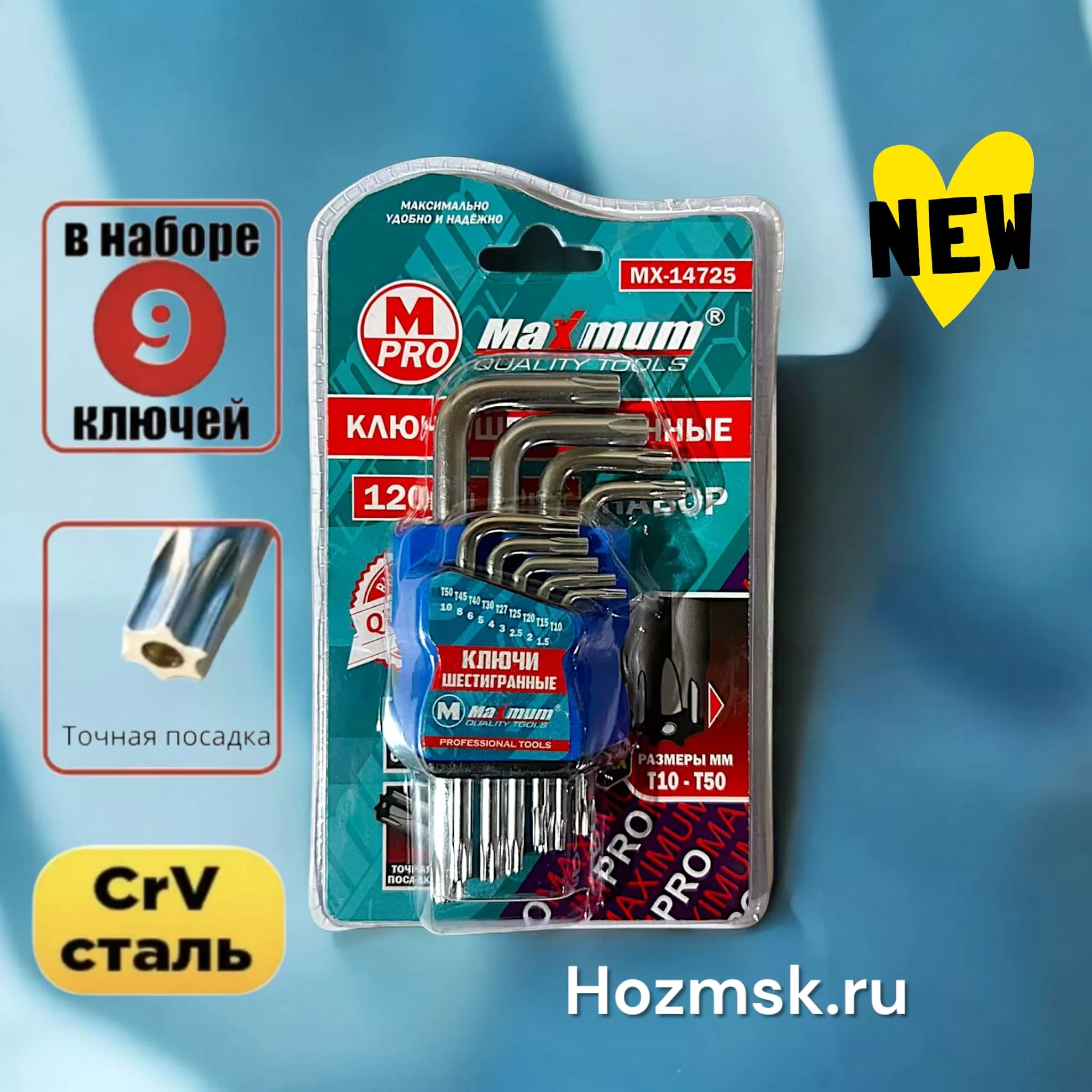 Набор мини ключей Torx включает в себя 9 специализированных инструментов форме шестилучевой звезды размером от Т10 до Т50 выполненых из CRV стали.