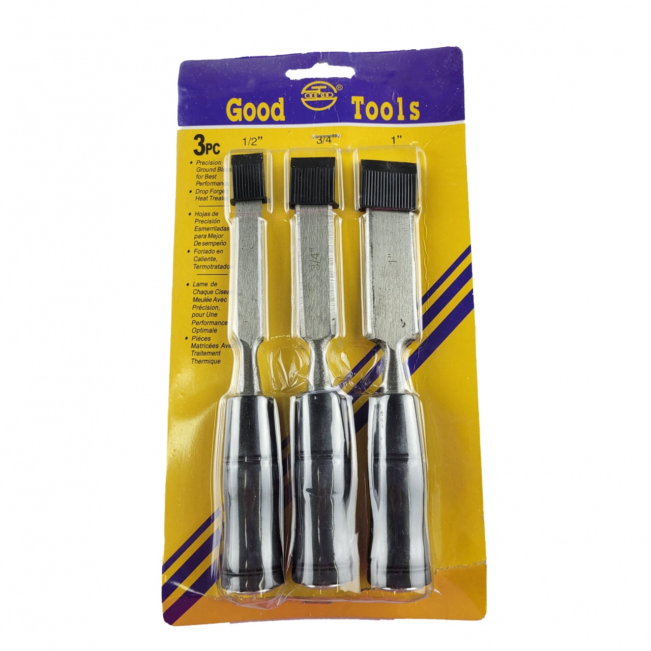 В комплект входят три стамески по дереву шириной 12, 18 и 25 мм.