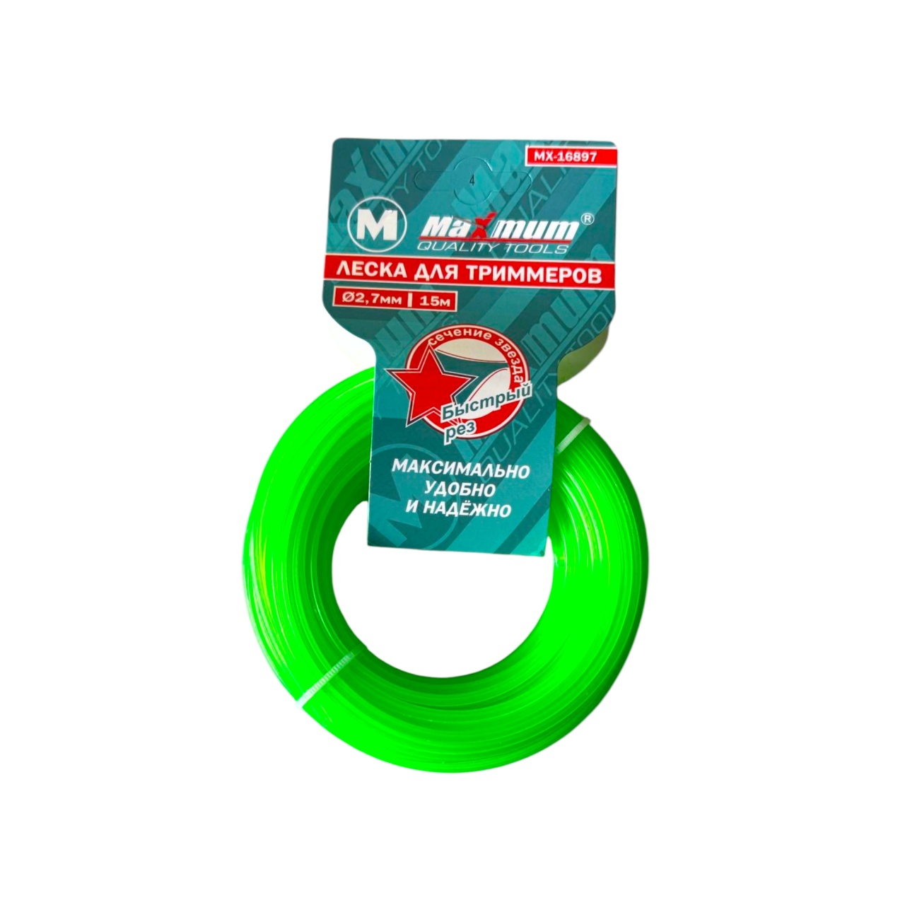 Леска для триммера от "MAXIMUM" с сечением «звезда» диаметром 2.7 мм и длиной 15 метров имеет агрессивный профиль для эффективного кошения густой и жесткой травы. Высокая прочность и износостойкость. Подходит для бензиновых и электрических триммеров.