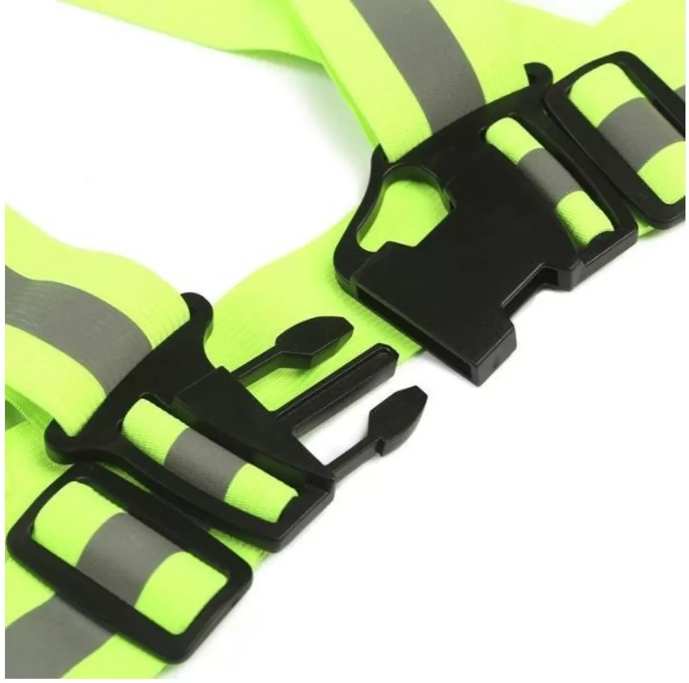 Ремень сигнальный универсальный салатовый с диагональными наплечными лямками, оснащен световозвращающим элементом в виде центральной полоски и изготовлен из сшитых между собой широких резинок 4 см. с регулируемыми пряжками-бегунками и застежкой фастекс.